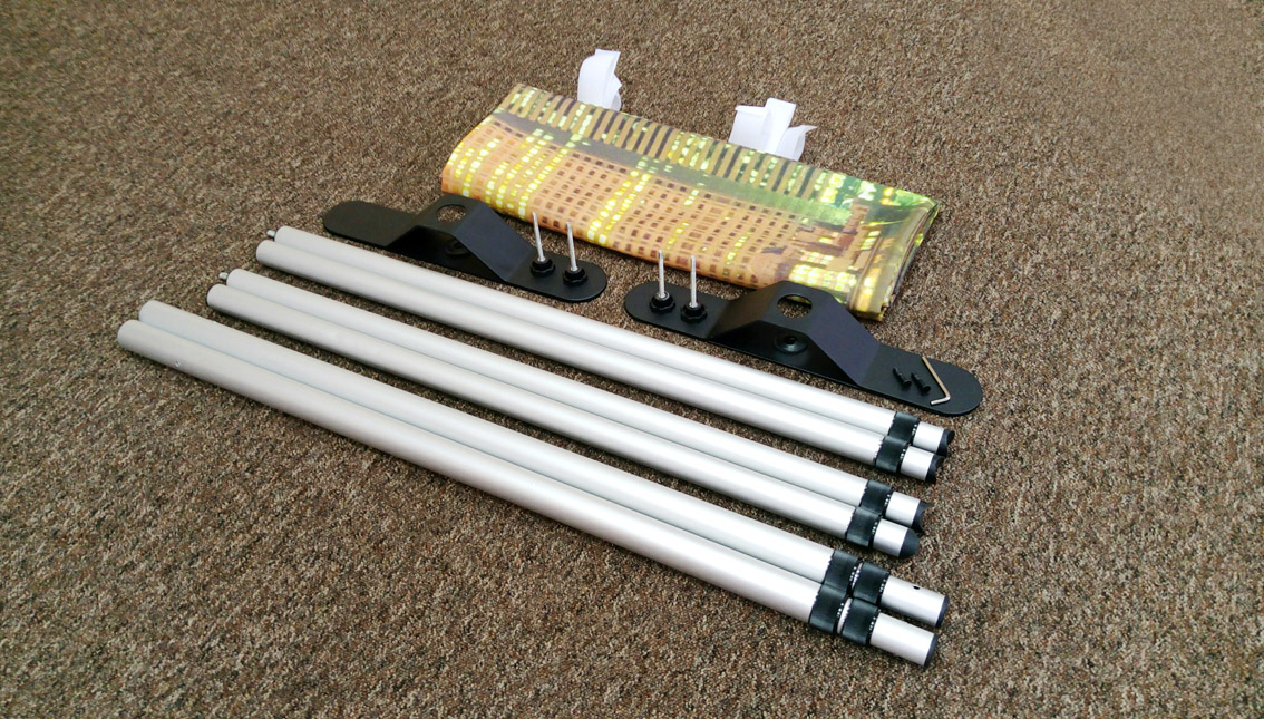 De telescopische display banner bestaat uit: een aluminium en stalen mechanisme, stof met een design en een transporttas. Afbeeldingen worden afgedrukt met behulp van sublimatie print technologie, wat zorgt voor uitzonderlijk levendige en duurzame kleuren. Het bedrukte materiaal is 210 g polyester decor met een B1 vlamvertragend certificaat. De gestikte, kant-en-klare afbeelding heeft twee tunnels (boven en onder) die klaar zijn voor het inbrengen van aluminium verstevigingselementen. De zijkanten van de afbeelding hebben dubbelgevouwen randen en klittenband dat is vastgenaaid voor spanning. Alle systeemelementen passen in één stevige transporttas en dankzij het lage gewicht van 10 kg is de telescopische grote verstelbare banner Lite gemakkelijk te vervoeren.